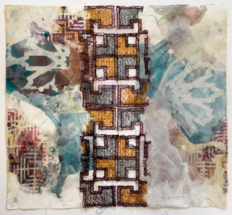 Hussaini reinterprets Palestinian identity through contemporary Tatreez, a traditional cross-stitch embroidery and the keffiyeh, which is a traditional headscarf. Her freehand stitched designs, created with a sewing machine on water-soluble fabric, blend with multimedia layers on canvas or paper. This intertwining reflects women’s self-expression and the diasporic identity. The torn and stitched layers symbolize the resilience of identity, demonstrating the complex interplay of cultural heritage and socio-political awareness in the face of diaspora.